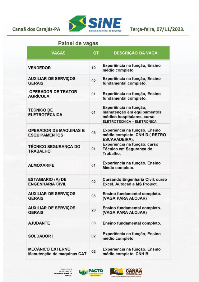Vagas do Sine Canaã de hoje 07/11/2023.