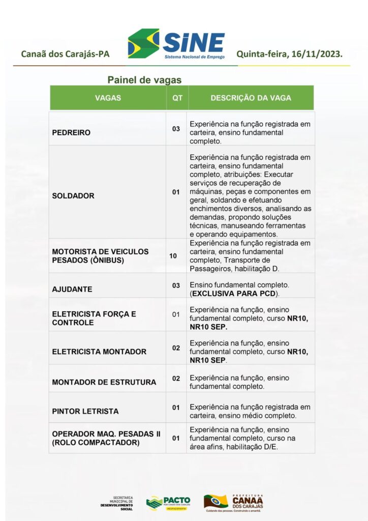 Vagas do Sine Canaã desta Quinta 16/11/2023.