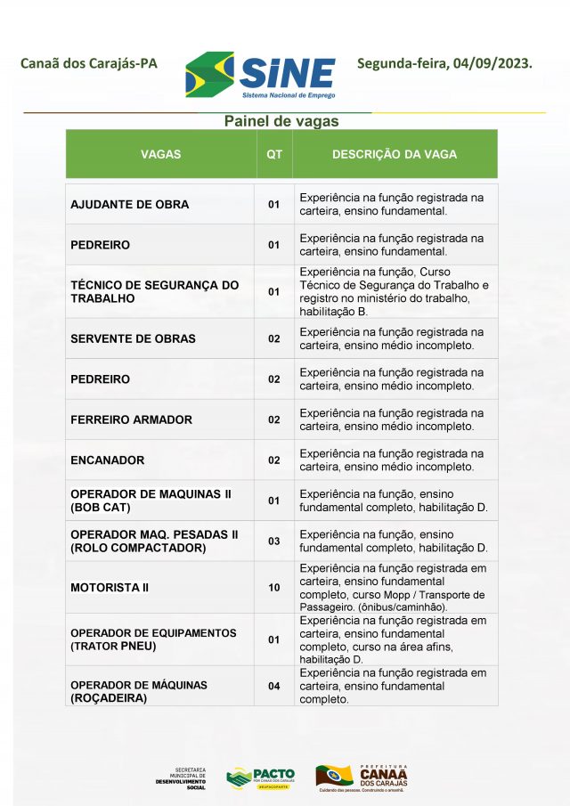 Vagas do Sine Canaã desta Segunda 04/09/2023.