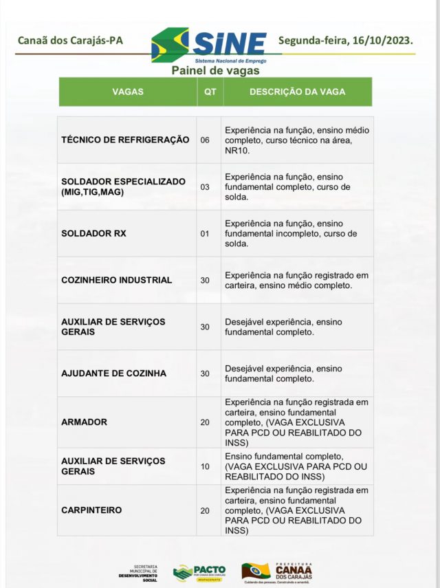 Vagas do Sine Canaã desta Segunda 16/10/2023.