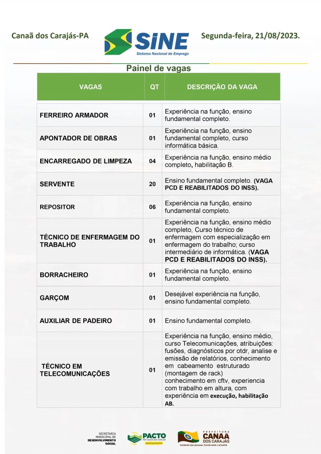 Vagas do Sine Canaã desta Segunda Feira 21/08/2023.