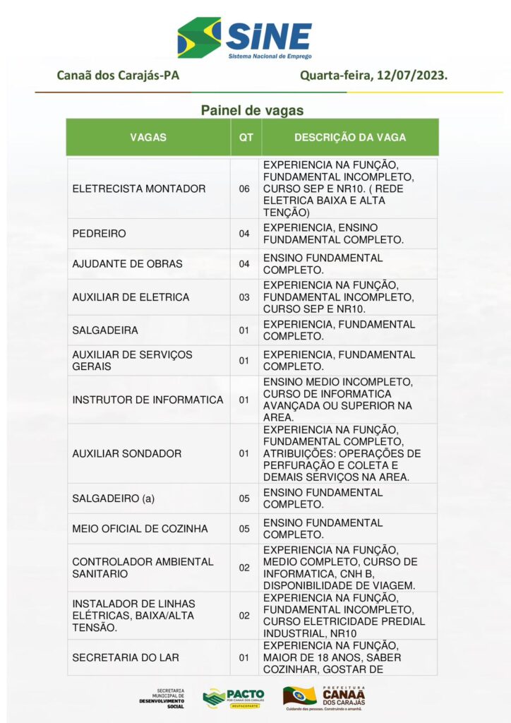 Vagas no Sine Canaã dos Carajás desta Quarta Feira 12/07/2023