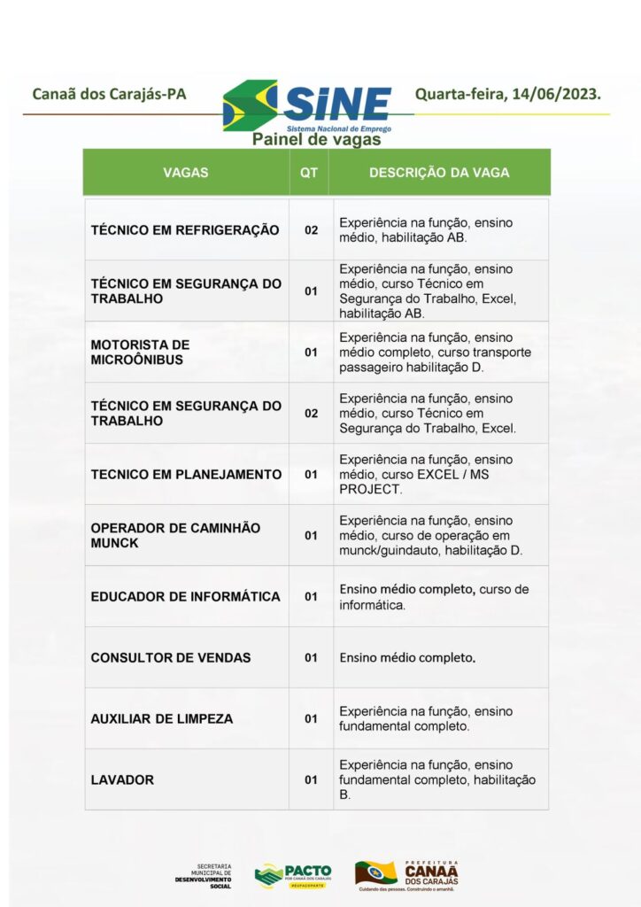 Veja as vagas disponíveis no Sine de Canaã dos Carajás hoje, 14/06/2023