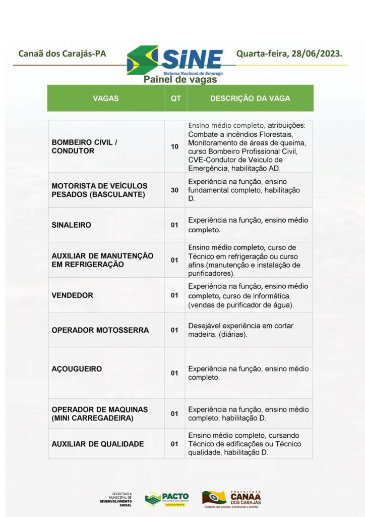 Veja as vagas disponíveis no Sine de Canaã dos Carajás hoje, 28/06/2023