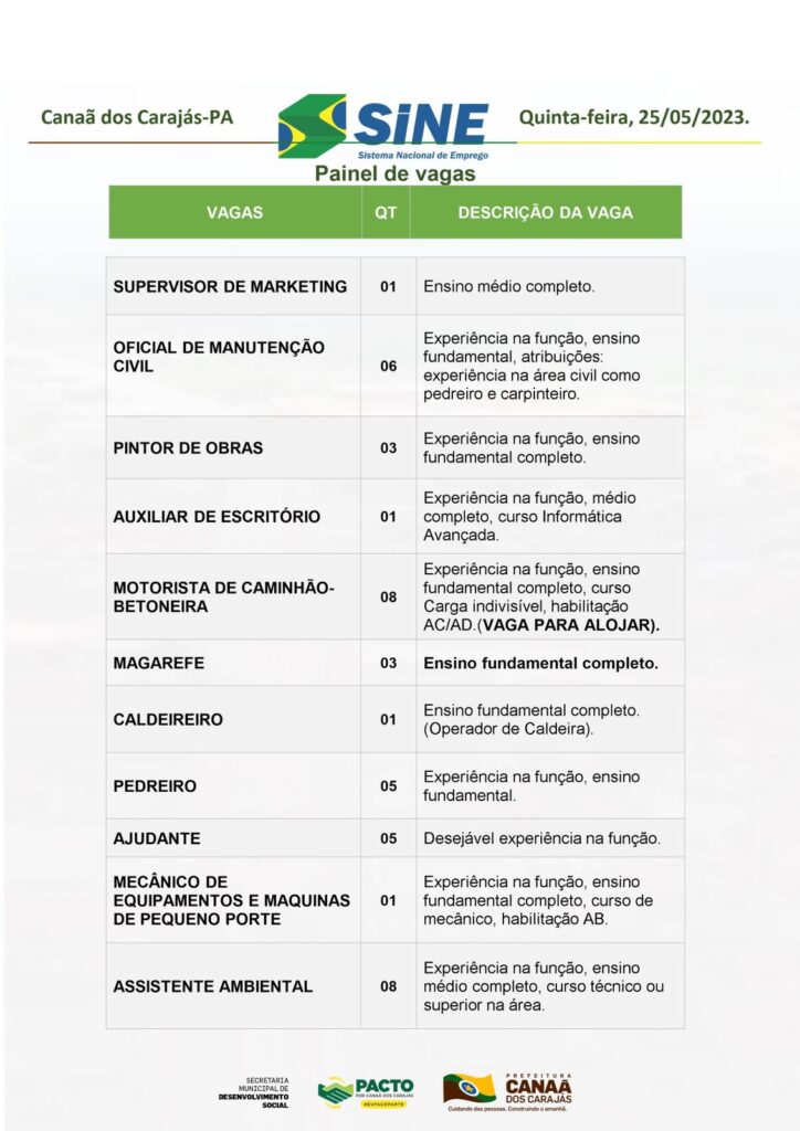 Vagas no Sine Canaã dos Carajás desta Quinta 25/05/2023