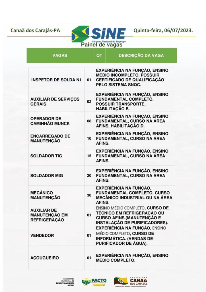 Vagas no Sine Canaã dos Carajás desta Quinta Feira 06/07/2023