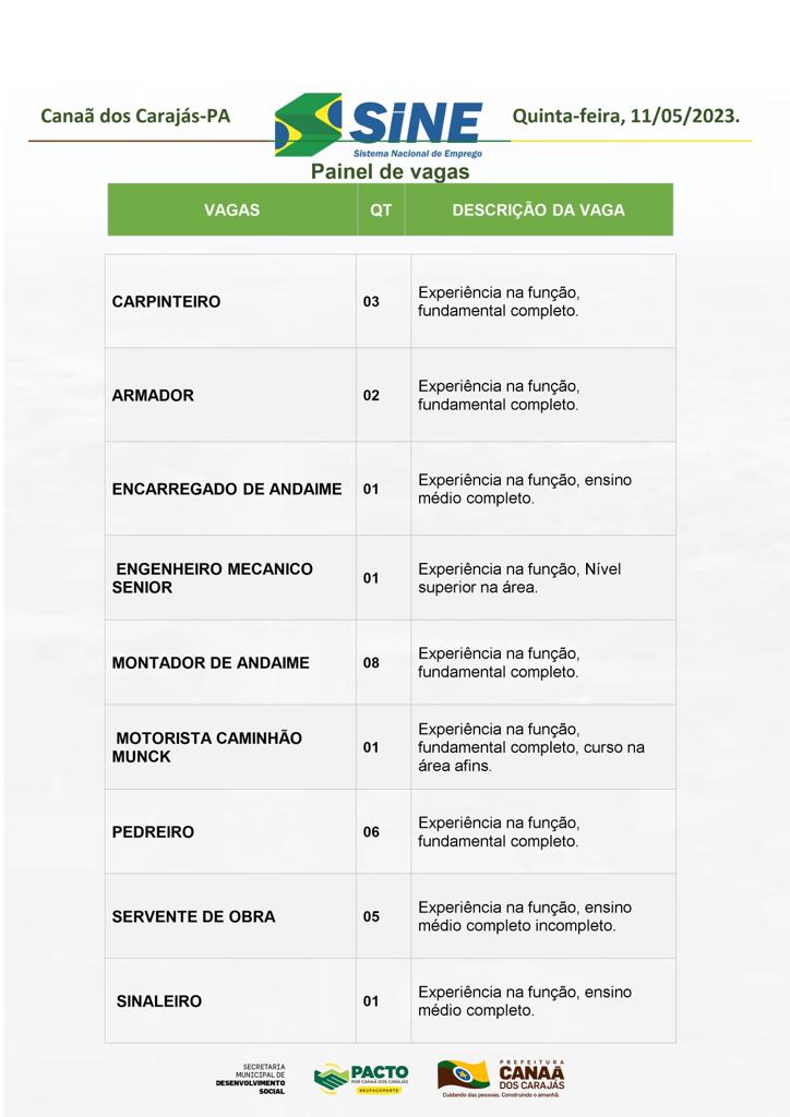 Veja as vagas disponíveis no Sine de Canaã dos Carajás hoje, 11/05/2023