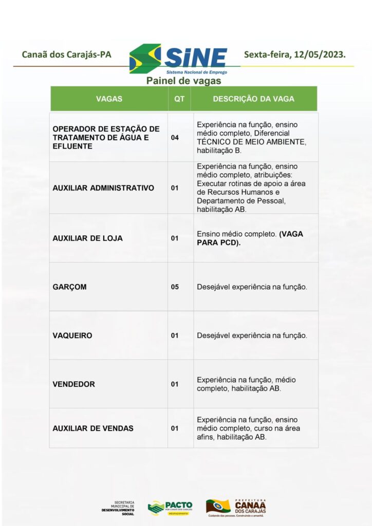 Vagas no Sine Canaã dos Carajás desta Quinta Feira 12/05/2023