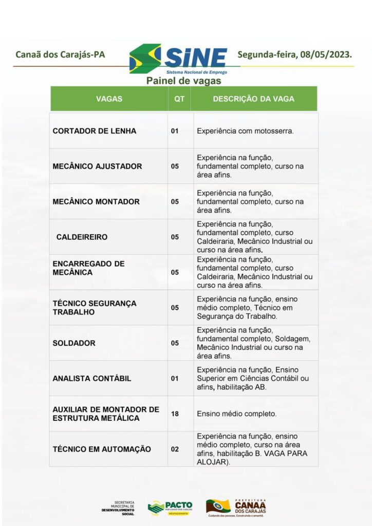 Vagas no Sine Canaã dos Carajás desta Segunda Feira 08/05/2023