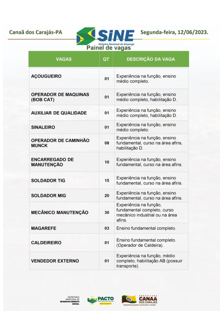 Vagas no Sine Canaã dos Carajás desta Segunda Feira 12/06/2023