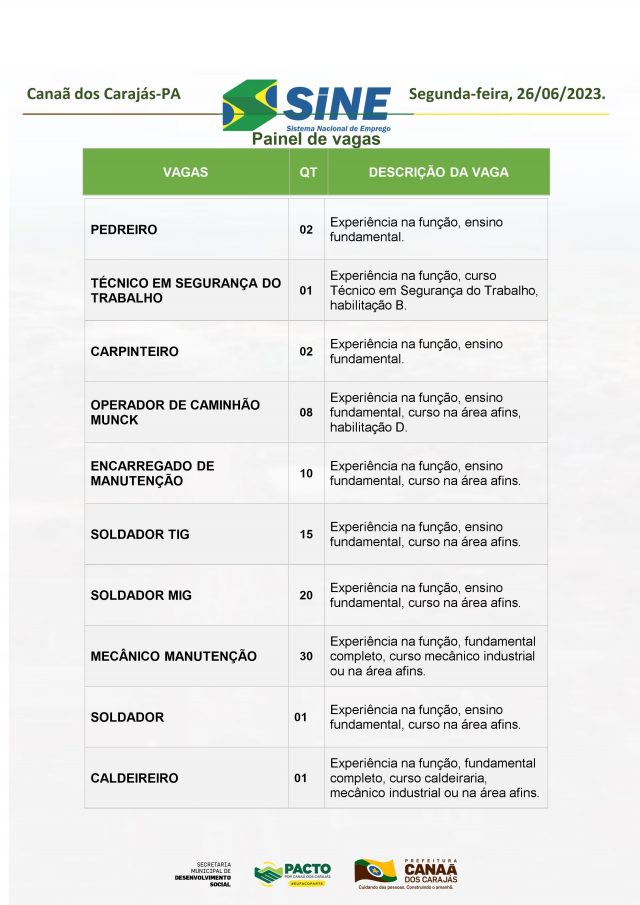 Veja as vagas disponíveis no Sine de Canaã dos Carajás hoje, 26/06/2023