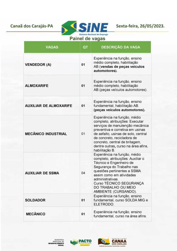 Vagas no Sine Canaã dos Carajás desta Sexta 26/05/2023
