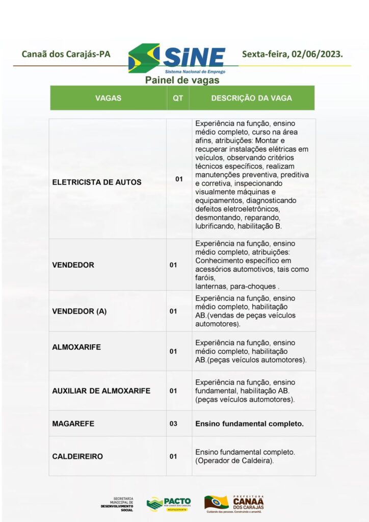 Veja as vagas disponíveis no Sine de Canaã dos Carajás hoje, 02/06/2023