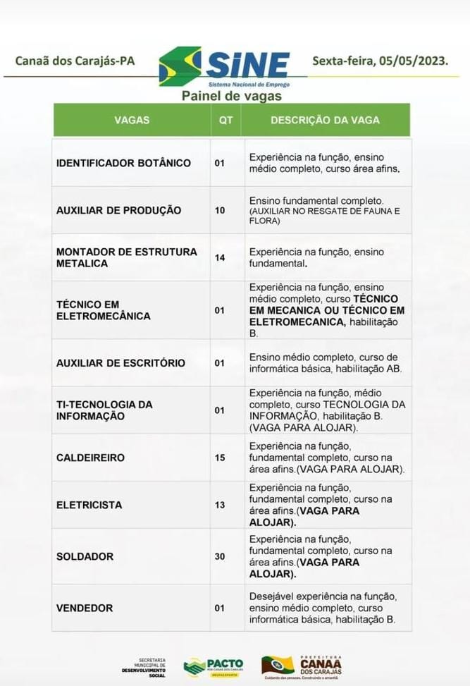 Veja as vagas disponíveis no Sine de Canaã dos Carajás hoje, 05/05/2023