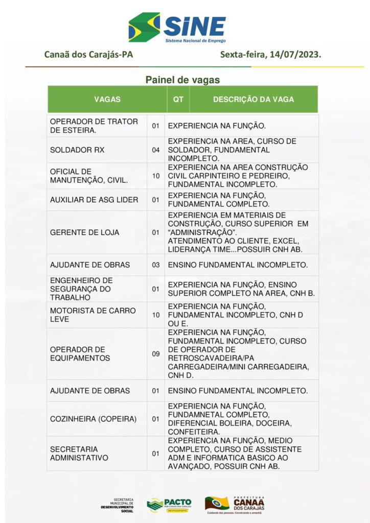 Vagas no Sine Canaã dos Carajás desta Sexta Feira 14/07/2023