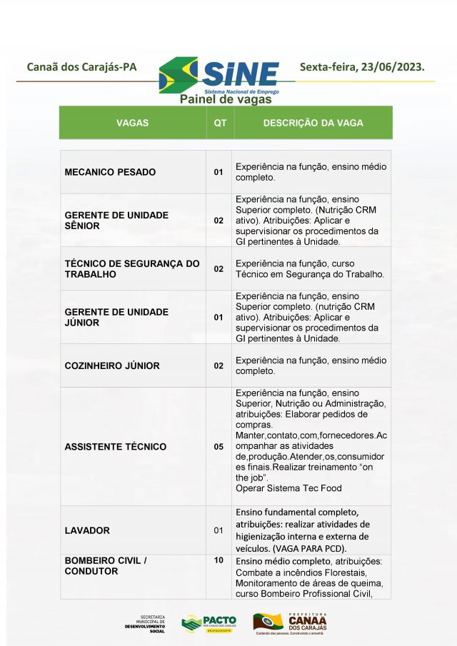 Veja as vagas disponíveis no Sine de Canaã dos Carajás hoje, 23/06/2023