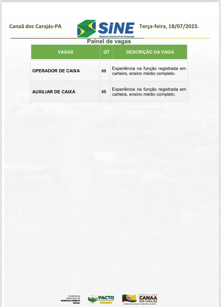 Veja as vagas disponíveis no Sine de Canaã dos Carajás hoje, 18/07/2023