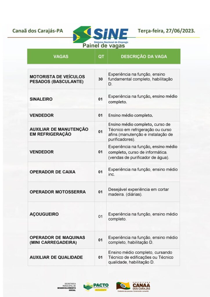 Veja as vagas disponíveis no Sine de Canaã dos Carajás hoje, 27/06/2023