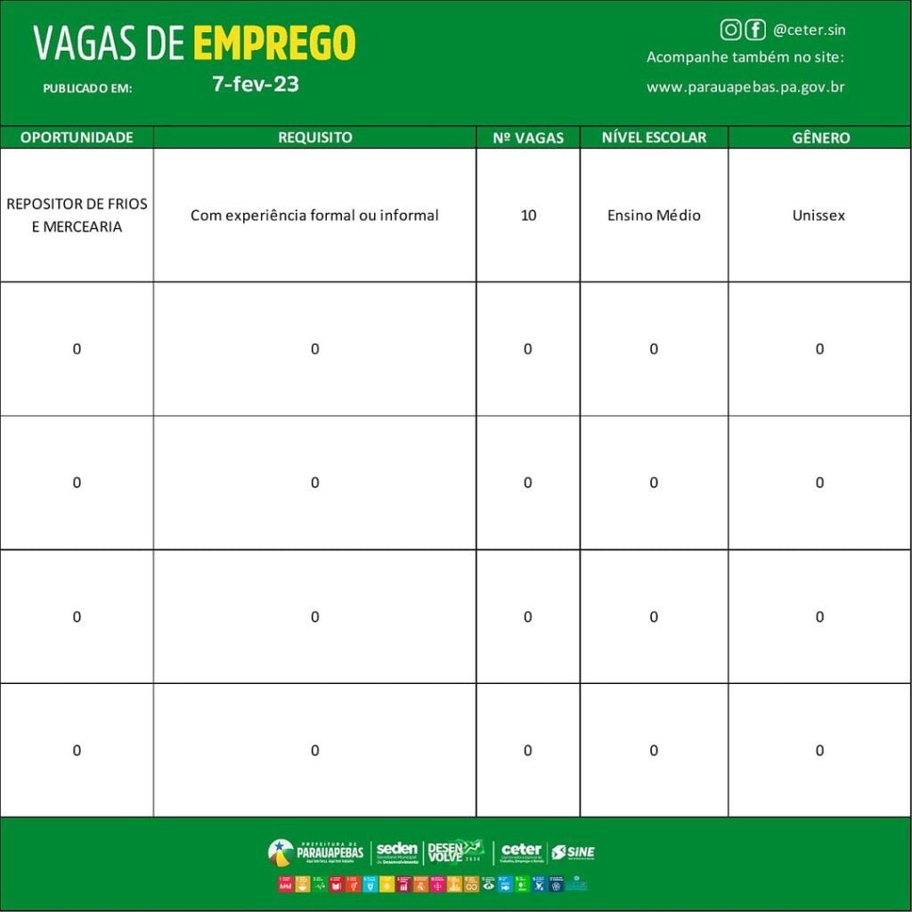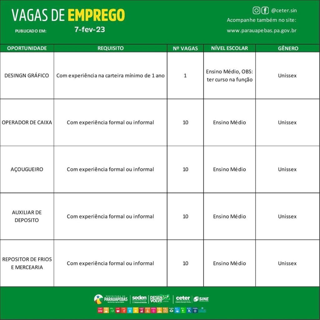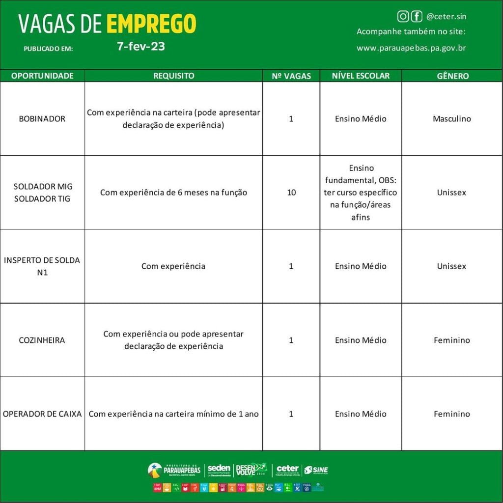 Veja as vagas de emprego disponíveis no Sine de Parauapebas hoje, 07/02/2023.