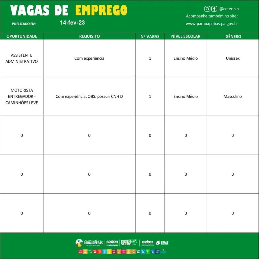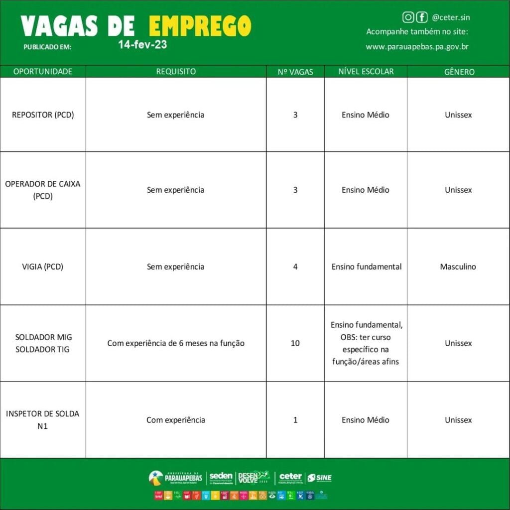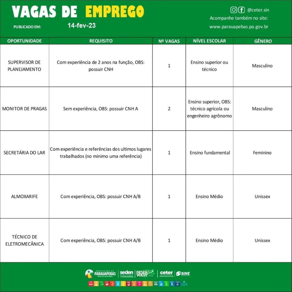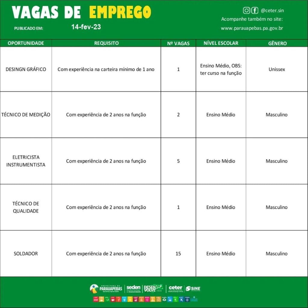O Sistema Nacional de Emprego (SINE) de Parauapebas, no Pará, está oferecendo diversas vagas de emprego nesta terça feira, 14 de fevereiro.