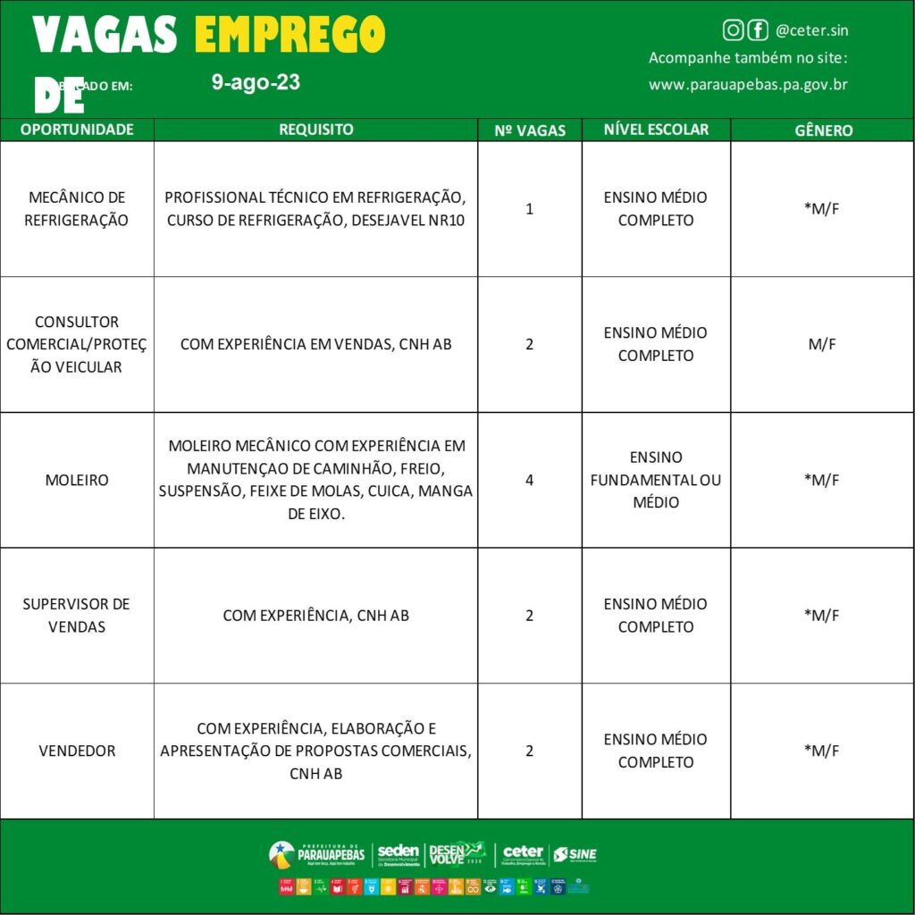 Vagas do Sine Parauapebas desta Quarta 09/08/2023.